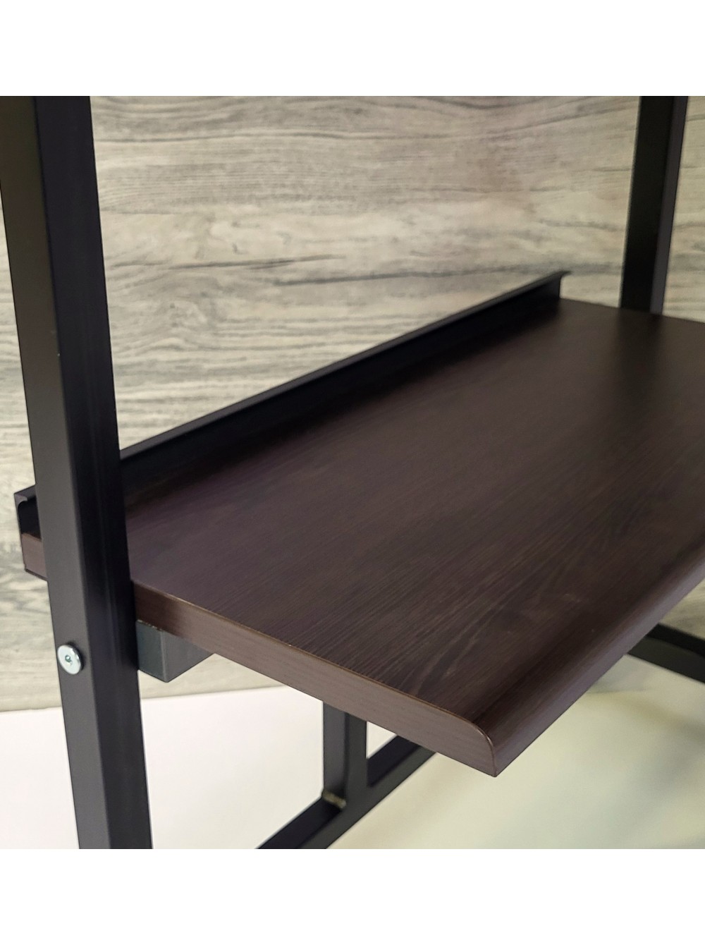 Может быть оснащен выдвижным ящиком или полкой под клавиатуру.