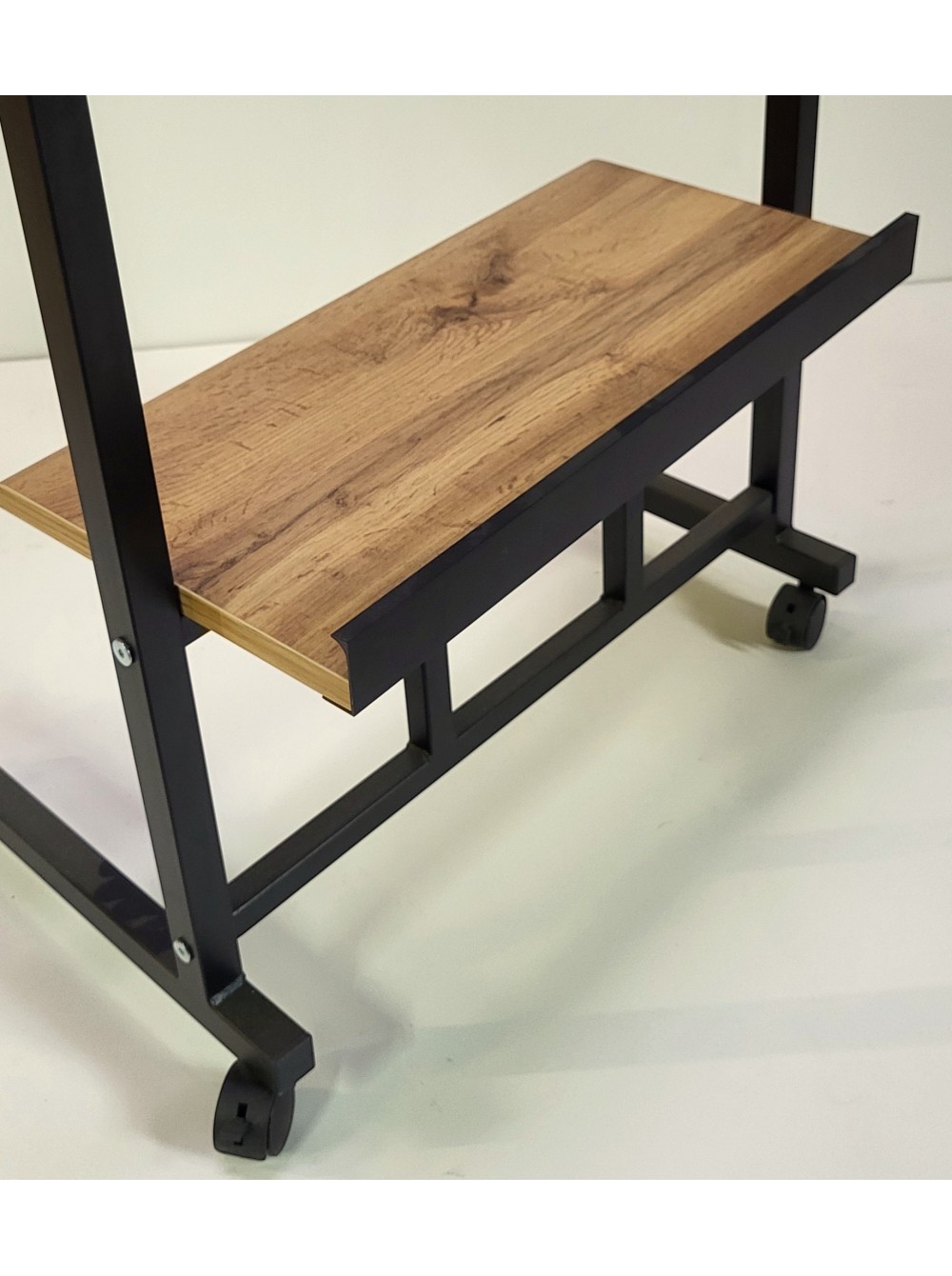 Мобильность компьютерного столика обеспечивают 4 колеса со стопорами. Регулировка по высоте осуществляется телескопическими направляющими каркаса стола фиксирующимися резьбовыми муфтами. Высота регулируется в пределах от 73см до 93см.